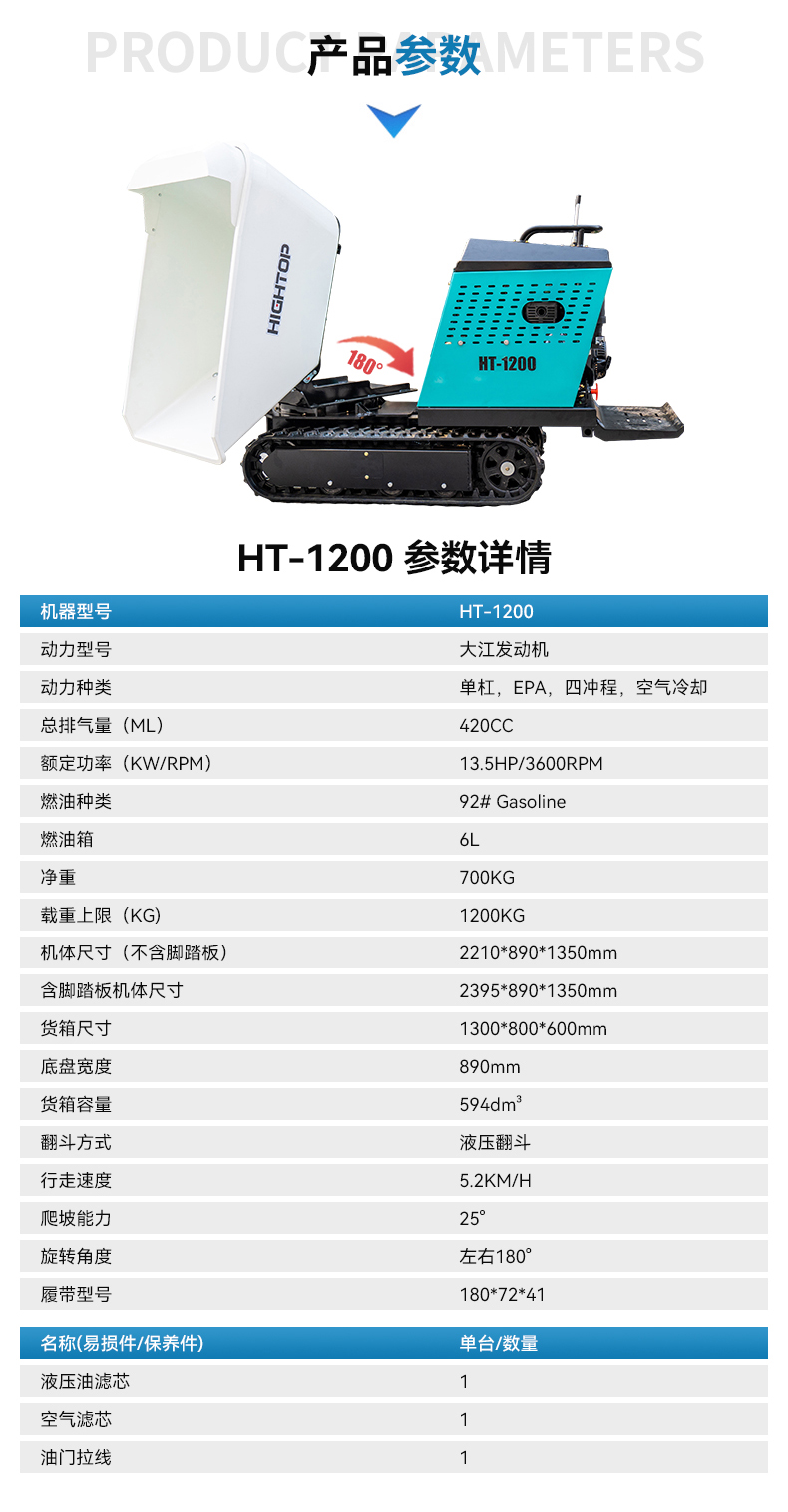 | 1200履带旋转翻斗车产品参数 | |