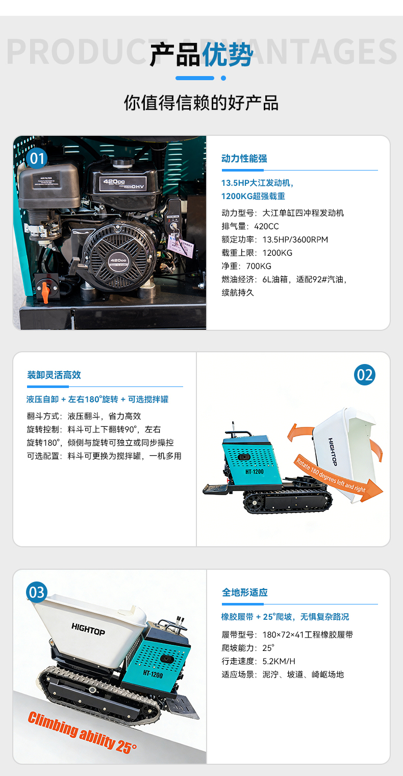1. 核心动力:13.5HP强劲引擎,1200KG轻松载